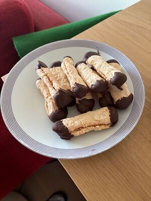 7. Chocolate. Temper the chocolate by melting to 45℃, cooling to 26-27℃, and raising heat back to 32℃. Dip each end of the biscuits into the tempered chocolate.